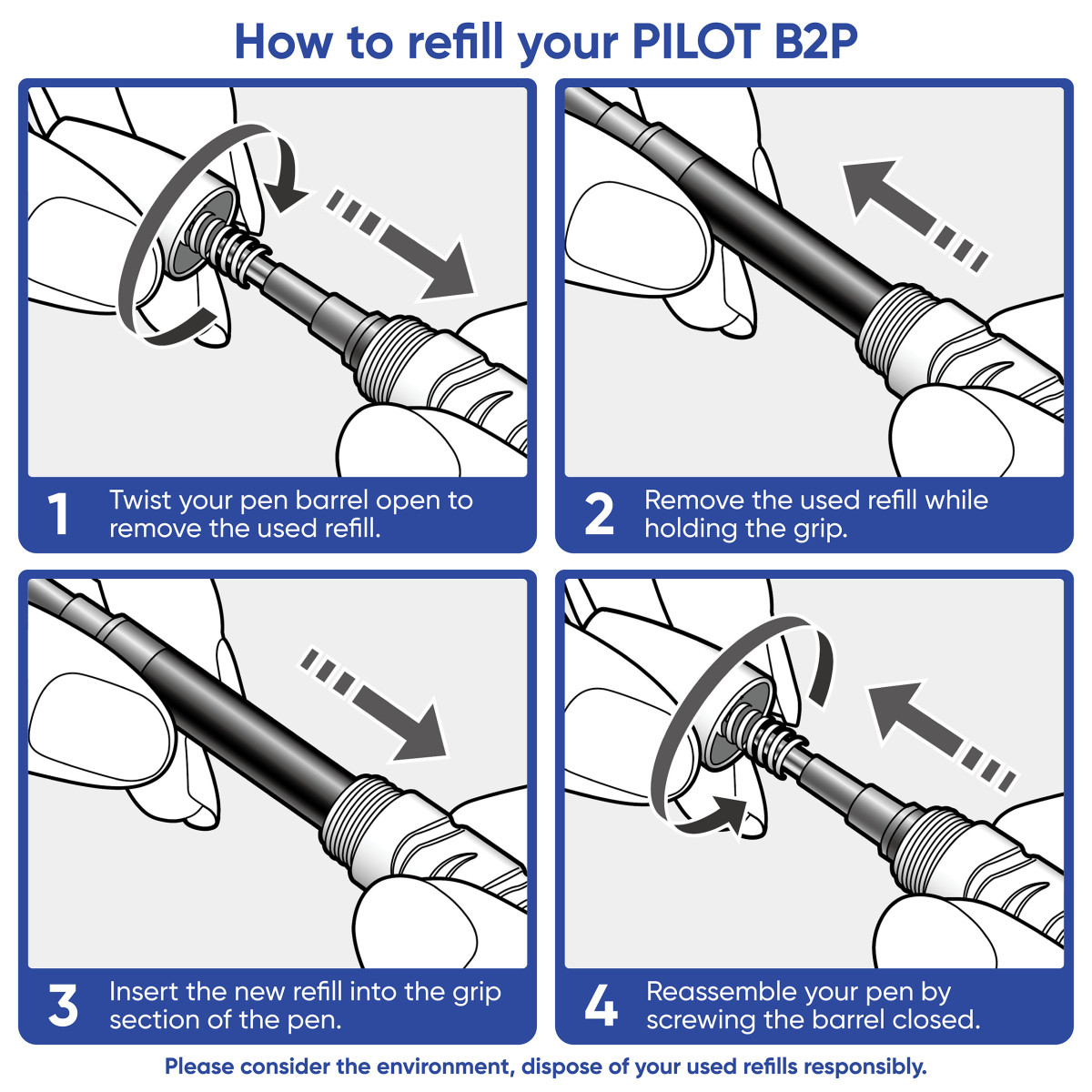 B2P Pen is refillable with PILOT RFNS-GG refills, available in black, blue, and red, seamlessly replenishing your pen, championing reduced waste and a lighter carbon footprint.
