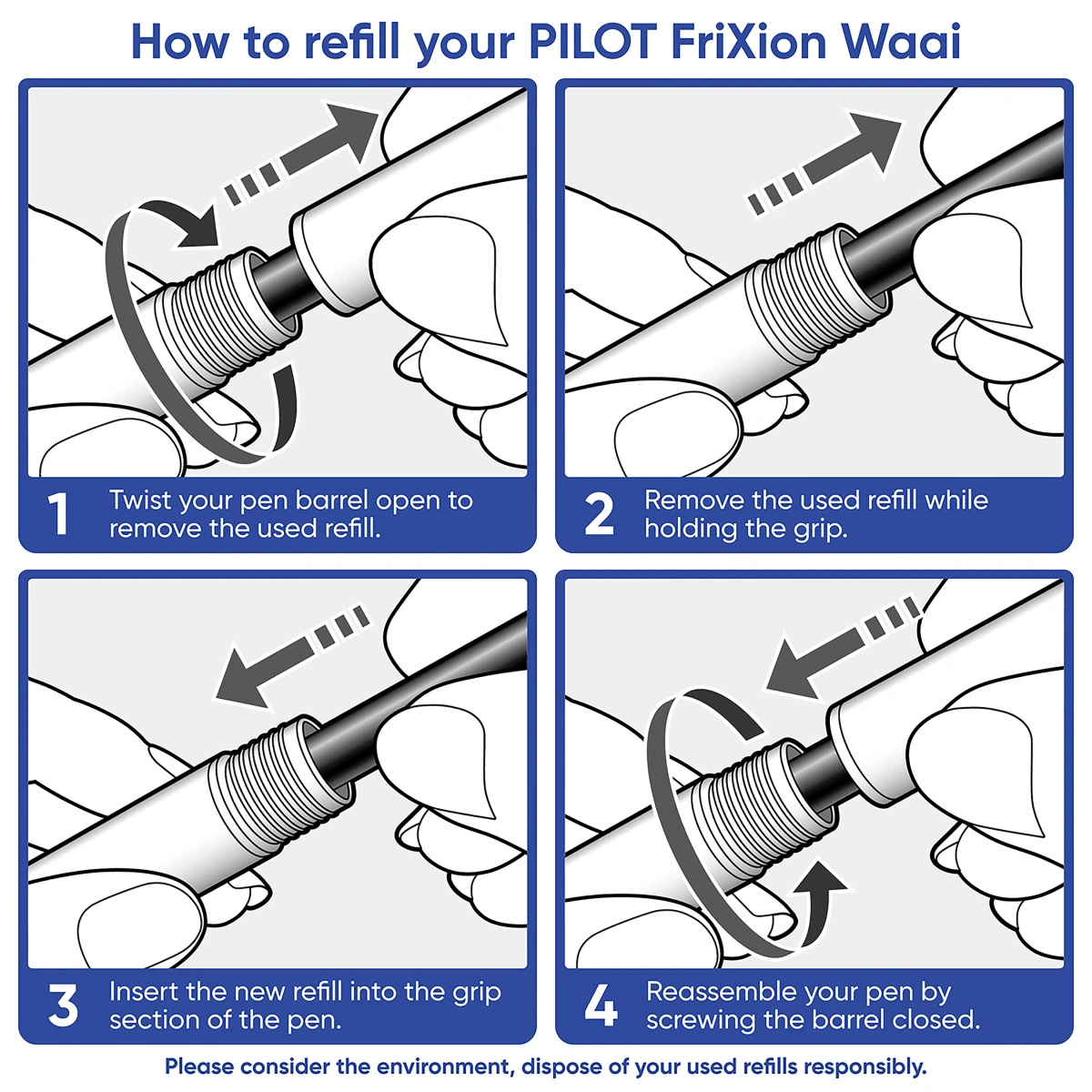 Choose from various colours to suit your needs. These refills are compatible with PILOT FriXion Waai, FriXion Ball and FriXion Clicker erasable gel pens.